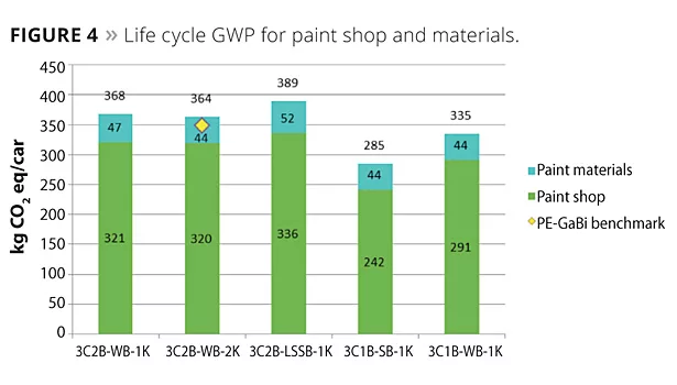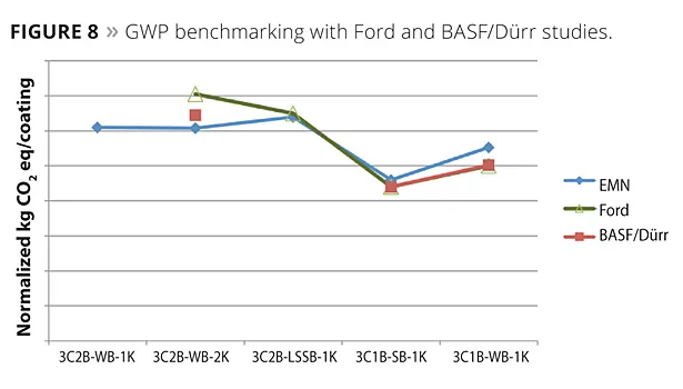 The results of the life cycle impact assessment calculations for Global Warming Potential (GWP) are presented in Figures 4-8. Figure 4 shows a comparison of GWP for the full coating system, including the ingredient production, paint formulation and OEM paint shop operations. The point marked “PE-GaBi benchmark” reflects the PE-GaBi data point, which provides an additional benchmark for the 3C2B-WB-2K case.