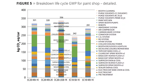There are two major observations from Figure 4. First, is that the modern, compact, high-solids SB process (3C1B-SB-1K) demonstrates the lowest GWP of all technologies, including the compact WB process. Second, is that the GWP impact of each technology is dominated by the paint shop operations. The GWP impact related to the production of paint materials is much less significant.
