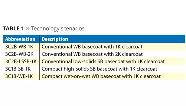 LCA is a tool well-suited to assessing such environmental issues for different paint shop technology options. Ford Motor Company,6 BASF7 and Dürr have presented LCA results in recent years that maintain that HSSB technologies can meet modern VOC regulations with decreased energy usage and greenhouse gas (GHG) impact as compared to WB technologies. In an effort to gain further insight and corroborate previous industry studies, Eastman sponsored an independent LCA study comparing the relative environmental performance of five prominent OEM auto paint shop configurations.
