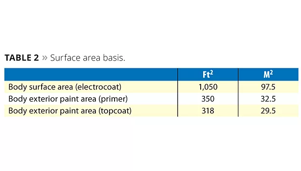 The functional unit of this study is one coated car body with the surface areas as shown in Table 2. Each layer of coating is applied to a specific surface area. The car is assumed to be a compact class C passenger vehicle (i.e., Ford Focus, Honda Civic, or equivalent) with its standard coating appearance and functional quality requirements. Each scenario is designed to meet these functional requirements. The coating functional requirements for a class C vehicle coating are equivalent across all scenarios according to IHS.