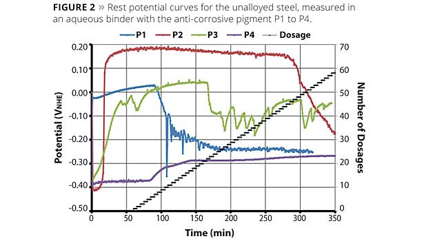 Pigments P2 (CMP) and P3 are pigment combinations of pigment P1 and P4 in a different ratio. The pigment combinations first had the characteristic initial potential drop at about -400 mV, and then a potential increase depending on the quantity of pigment P4 added. The greater the quantity of pigment P4 (100% magnesium component) added to the pigment combination, the longer the metal needed to develop a passive-like surface state, and the longer therefore it took for the potential rise to occur.