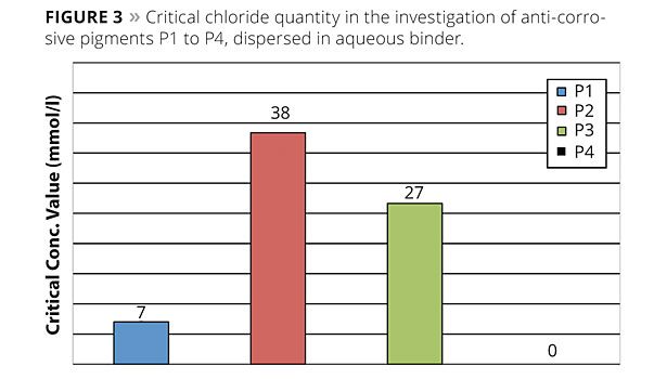 Figure 3 illustrates the critical chloride quantities identified at the characteristic potential drop for the anti-corrosive pigments P1 to P4 dispersed in the binder. The mean value is shown in each case, calculated using a minimum of three individual measurements. Pigment P2 (CMP) displayed the highest critical concentration value, pigment P1 and particularly P4 the lowest.