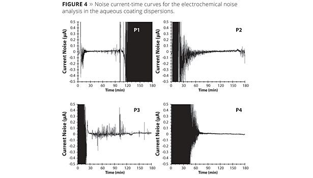 Figure 4 shows the noise current-time curves over the entire test period of 180 min for the unalloyed steel in aqueous binder with the anti-corrosive pigments P1 to P4.