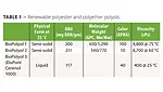 A series of polyester biopolyols with 100% biocarbon content was prepared from various combinations of raw materials selected from those described above using standard synthesis methods. After screening several with a range of compositions, molecular weights and physical properties, two were chosen for this study. Choices were made based on the relative ease of preparation, ready availability of the raw materials and expected performance in UV-PUD-based coatings. As these polyester biopolyols are designed to be quite hard, and UV-PUDs derived from them tend to be brittle, we found it advantageous to use them in combination with a more flexible biopolyol. Cerenol 1000 (DuPont) is a 1000 molecular weight poly(1,3-propanediol) polyether derived from DuPont’s Susterra bio-sourced 1,3-propanediol.10 Properties of these biopolyols are shown in Table 1.