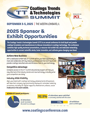 The Coatings Trends & Technologies Summit (CTT) is an annual conference for both liquid and powder coatings formulators and manufacturers to discuss innovations in coatings technology. This conference combines high-quality technical presentations, a resource-rich exhibit hall, and dedicated networking opportunities to connect scientific minds, foster innovation, and cultivate game-changing new ideas!